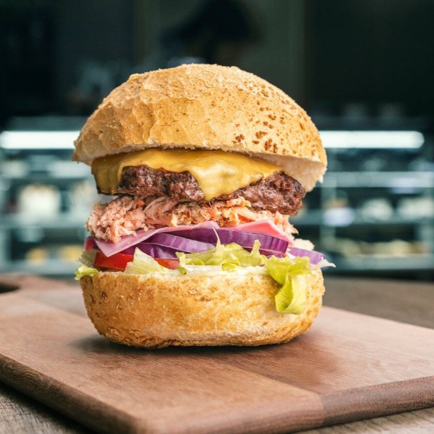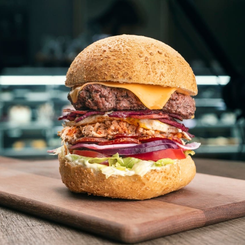 Um exagero de sabor! Hambúrguer artesanal, aquela famosa maionese da casa, salada fresquinha (alface, tomate e finas tiras de cebola), bacon, calabresa, frango, ovo e queijo cheddar no nosso pão d'água.