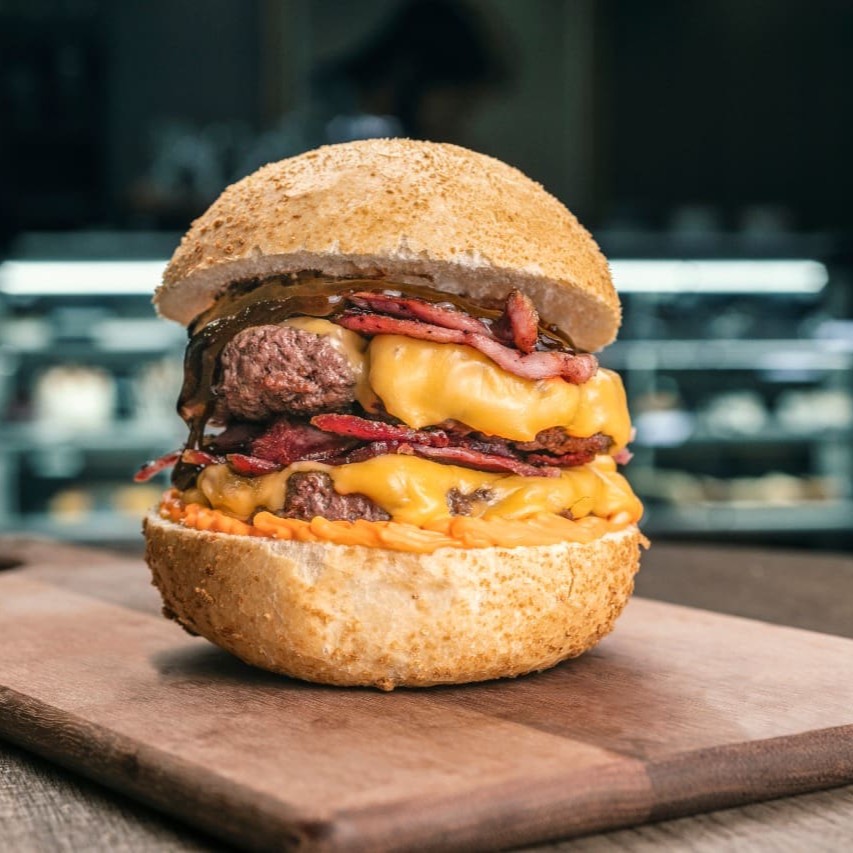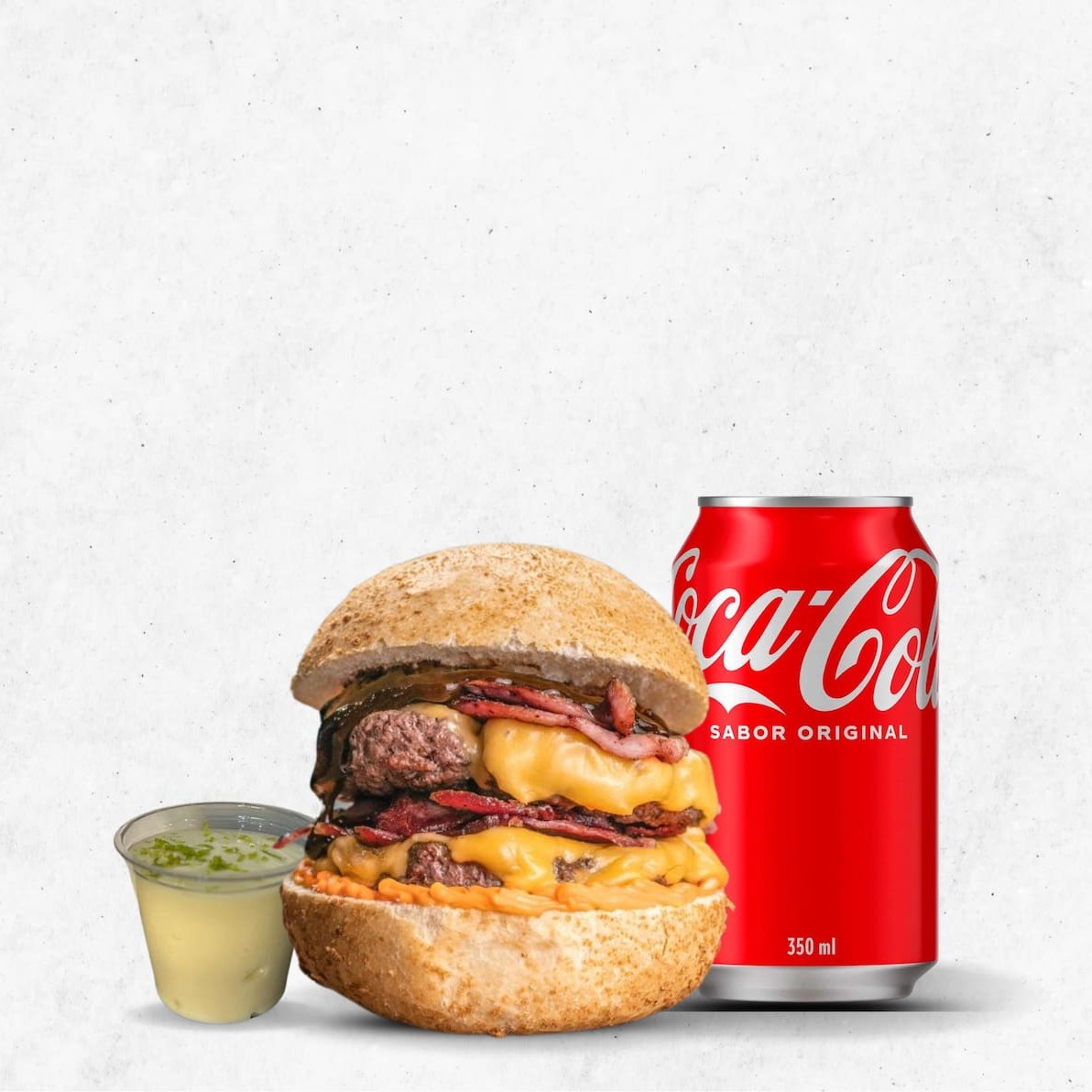 Tudo que é bom queremos em dobro! Dois hambúrguers artesanais, aquela famosa maionese da casa, double cheddar em fatias, double bacon, cheddar super cremoso e barbecue no nosso pão d'água.
