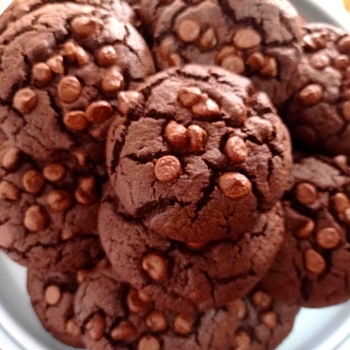 Delicioso biscoito americano que desmancha na boca exagerado no chocolate. Massa feita com cacau e gotas de chocolate e coberto com mais gotas de chocolate.