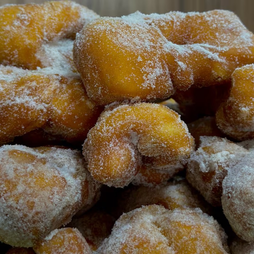 Massa doce, frita e levemente crocante, polvilhada com açúcar, perfeita para acompanhar o café da tarde.