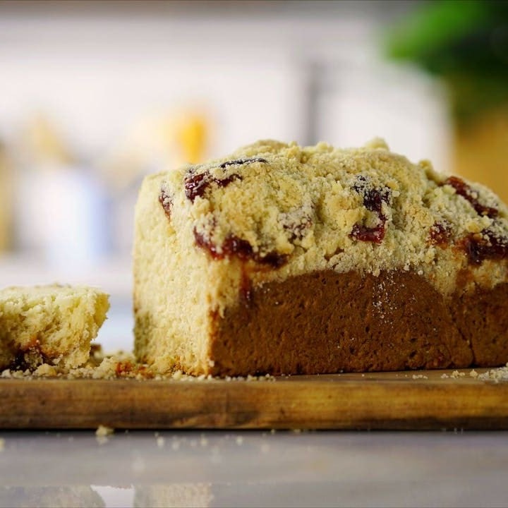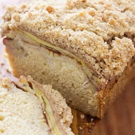 Cuque com massa muito macia e textura leve generosamente recheada com banana e coberta com farofa. Fofo, bem recheado e delicioso.