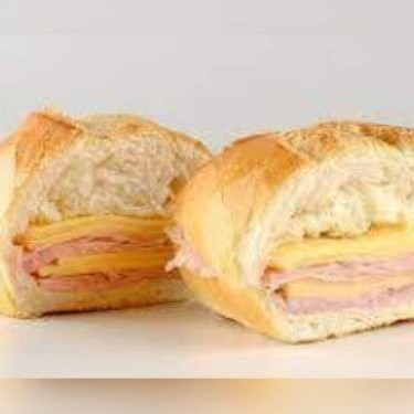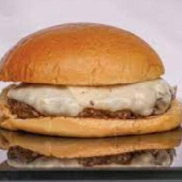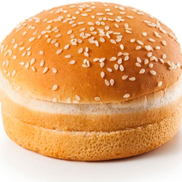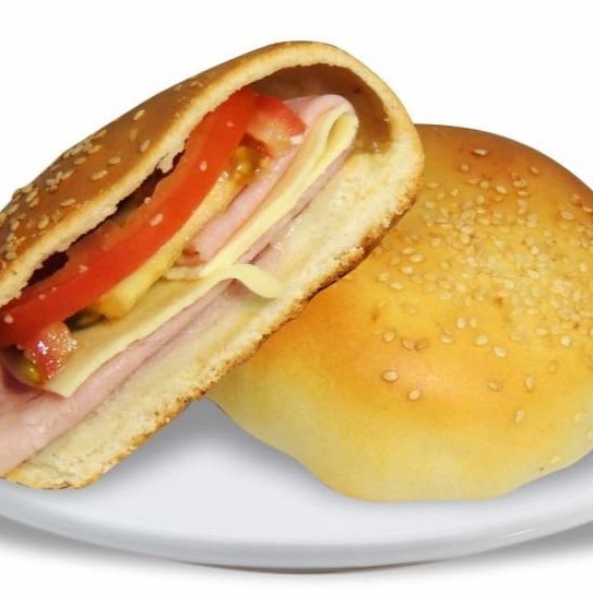 Pão de hamburgue, hamburgue bovino, queijo e presunto