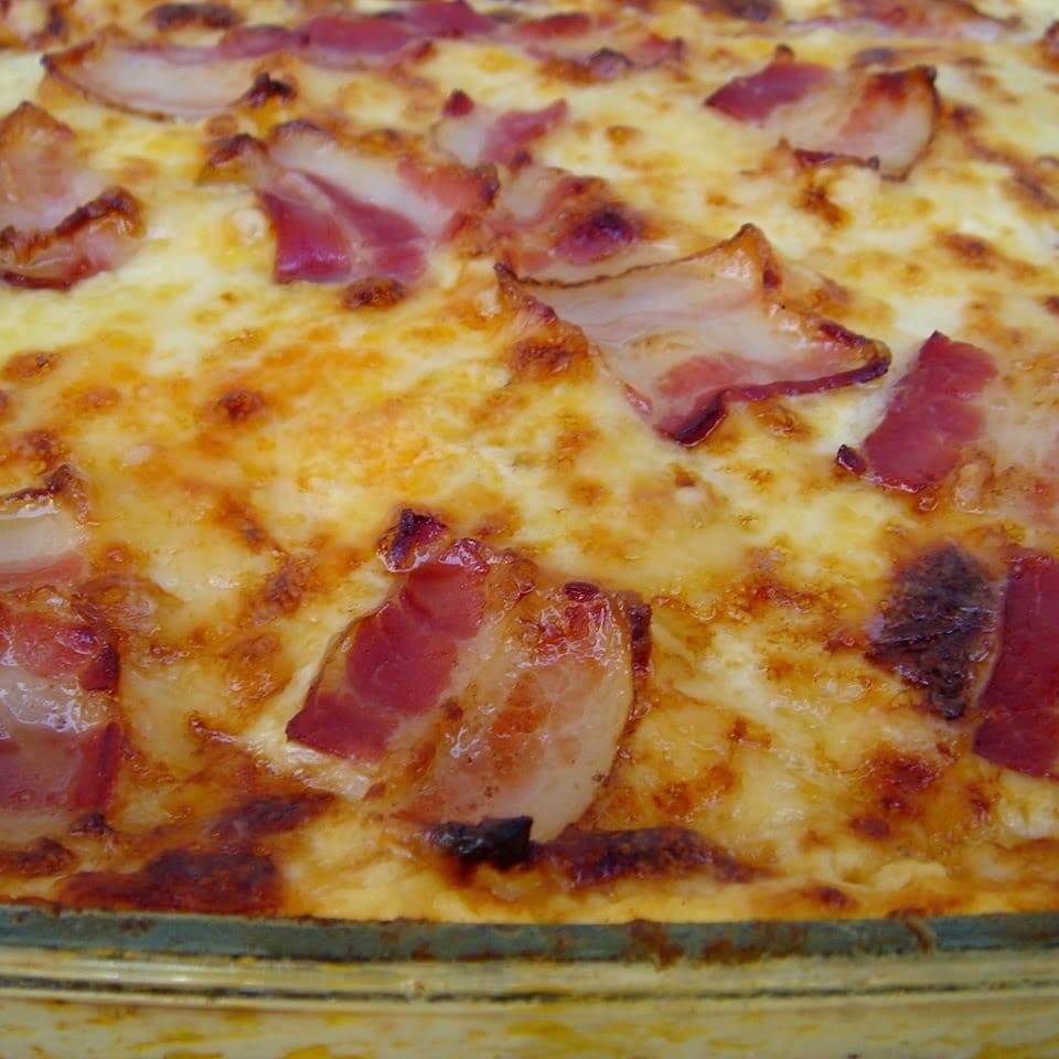 Queijo mussarela, presunto e tomate, coberto com queijo.