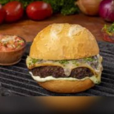 Hambúrguer bovino, queijo mussarela, presunto e tomate.
