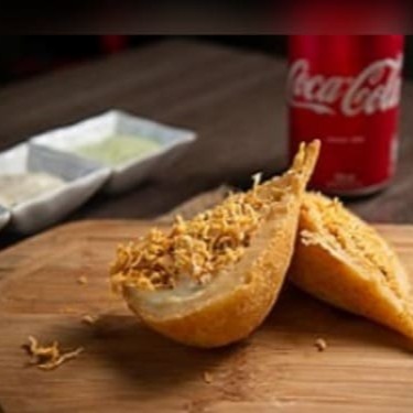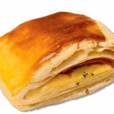 Massa leve com recheio de presunto, queijo, milho, tomate e oregano +- 150g ou massa leve com recheio de frango,queijo, batata palha e oregano +- 150g