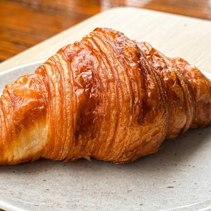 Croissant Grande de estilo francês e autêntico. Este primor culinário é uma delícia descomplicada, sem recheio para realçar o sabor irresistível da massa leve e aerada. Uma obra-prima da panificação, com uma crosta exterior crocante e uma interior macio e amanteigado. Perfeito para um café da manhã requintado ou um lanche da tarde sofisticado.