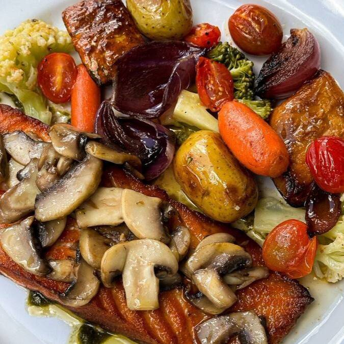 Salmão grelhado servido com cogumelos refogados e legumes assados