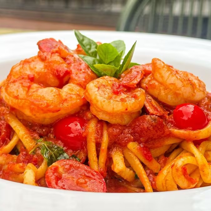Massa fresca salteada com camarões, molho pomodoro, tomate