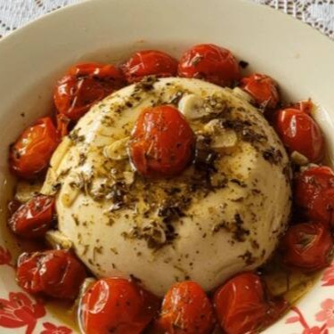 Burrata com confit de tomate cereja, rúcula, presunto parma