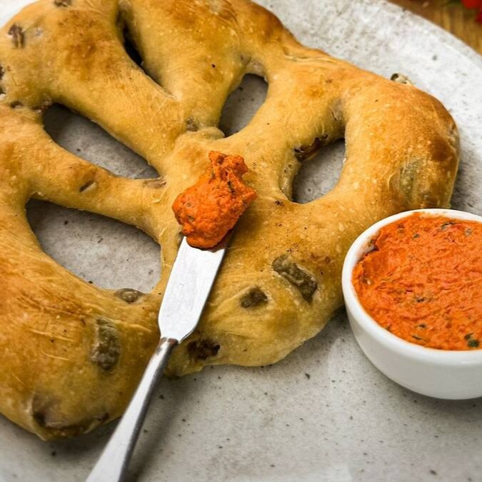 Pão em formato de folha com massa de fermentação natural, azeitonas e azeite de oliva.