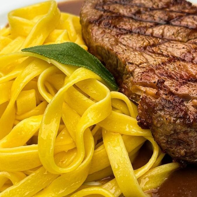 Entrecot grelhado servido com legumes assados ou fettuccine