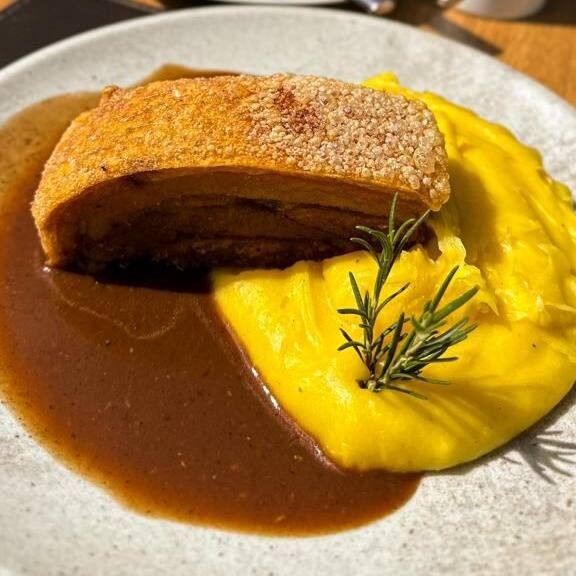 Costelinha de leitão servida com purê de mandioquinha e