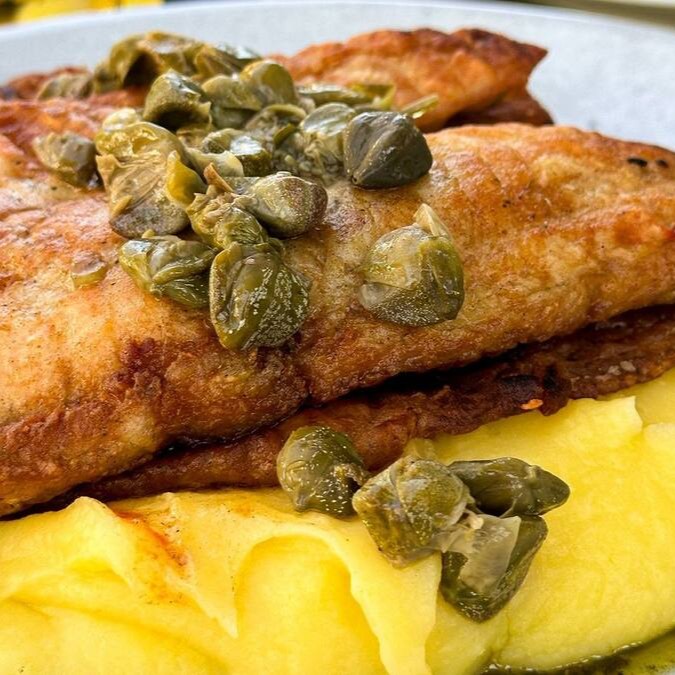 Tilápia grelhada servida com purê de mandioquinha e molho de alcaparras