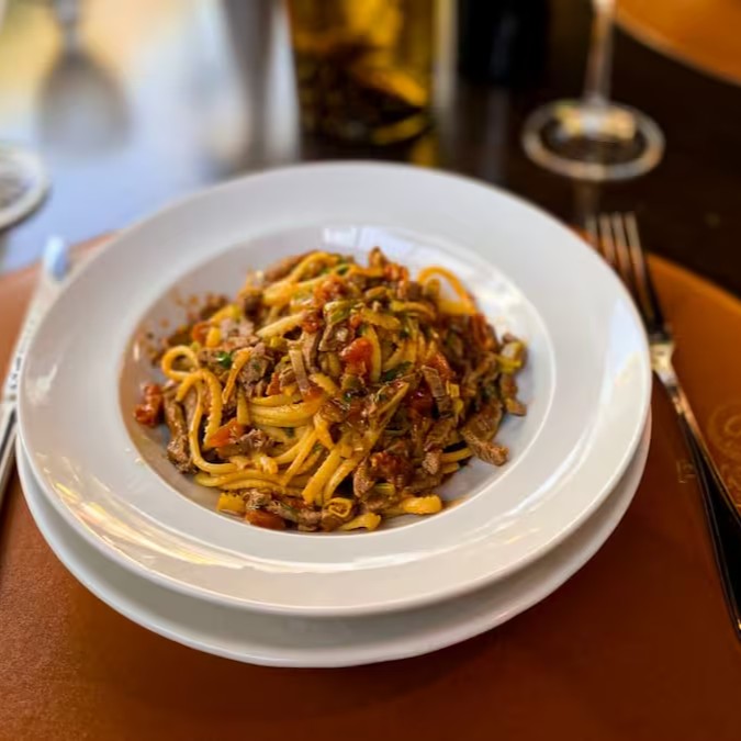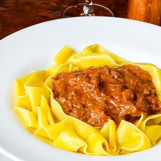 Papardelle artesanal (massa larga) com molho de ragú de cordeiro assado.