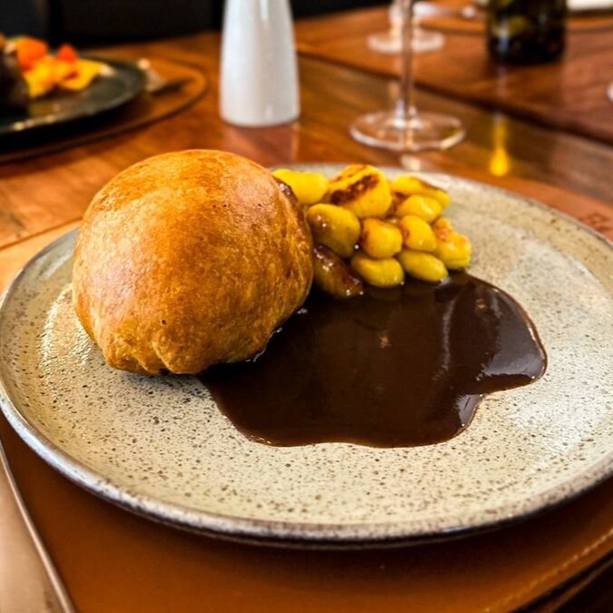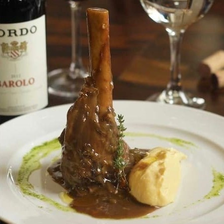 Corte bovino cozido lentamente em molho de vinho tinto, tomate e ervas, servido com polenta cremosa.