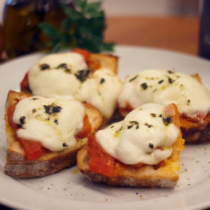 Bruschetta com pomodoro e mozarela de búfala. (4 unidades)