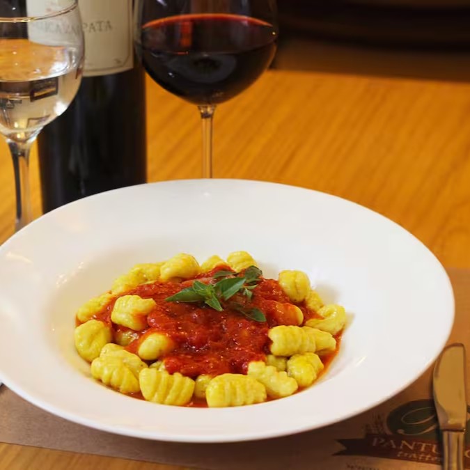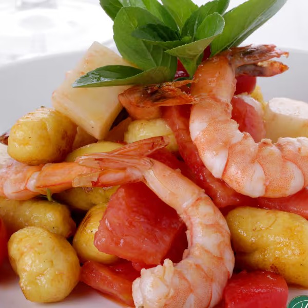 Gnocchi de batata com camarões médios, palmito e tomates frescos.