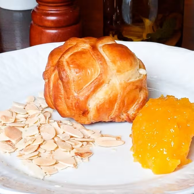 Queijo brie envolto em massa folhada com geleia de damasco e amêndoas laminadas.