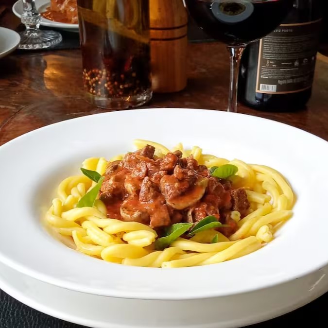 Strozzapretti (massa curta em formato de "S") servida com molho ragú de carne com cogumelos frescos.