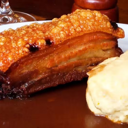 Costelinha de leitão a pururuca servida com purê de mandioquinha e molho demi-glacê.