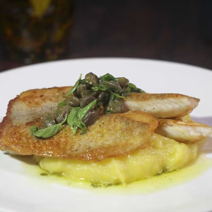 Tilápia grelhada servida com purê de mandioquinha e alcaparras.