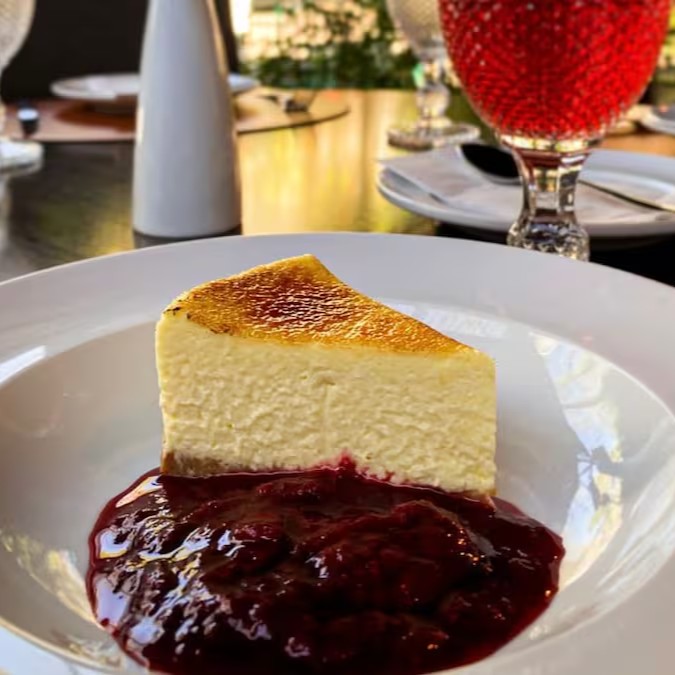 Cheesecake de limão siciliano com calda de frutas vermelhas.