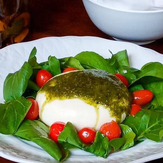 Burrata com confit de tomate cereja, rúcula e molho pesto.