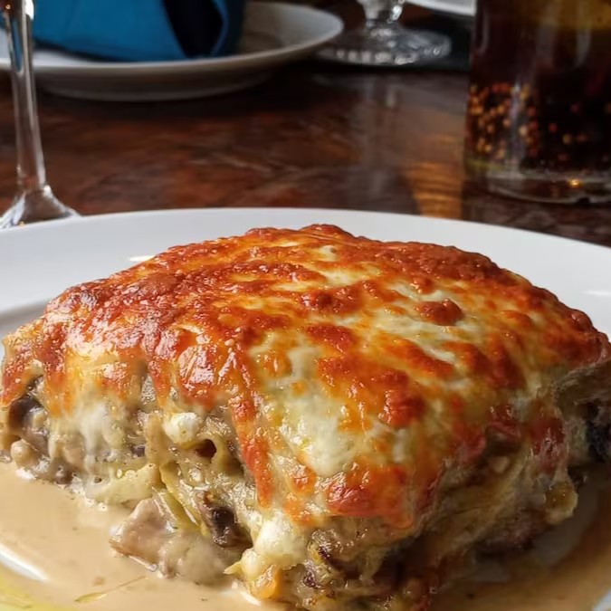 Lasanha de massa verde com alcachofra e cogumelos com molho de funghi porcini.