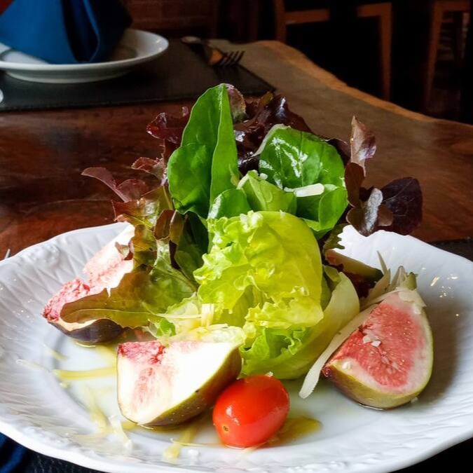Salada de figos frescos, folhas, amêndoas laminadas e lascas de parmesão.