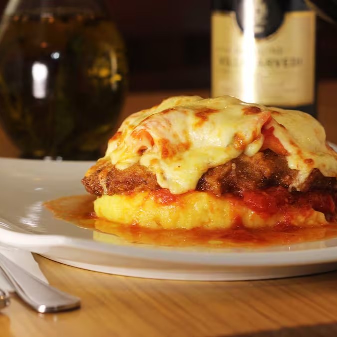 Filé mignon empanado, gratinado com tomate e queijo, servido com purê de mandioquinha ou polenta cremosa ou fetuccine e molho pomodoro.