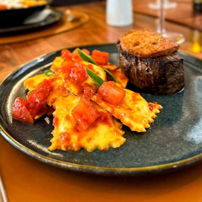 Filé mignon alto, assado com crosta de ervas, servido com ravióli de mozarela de búfala, tomates frescos e manjericão.
