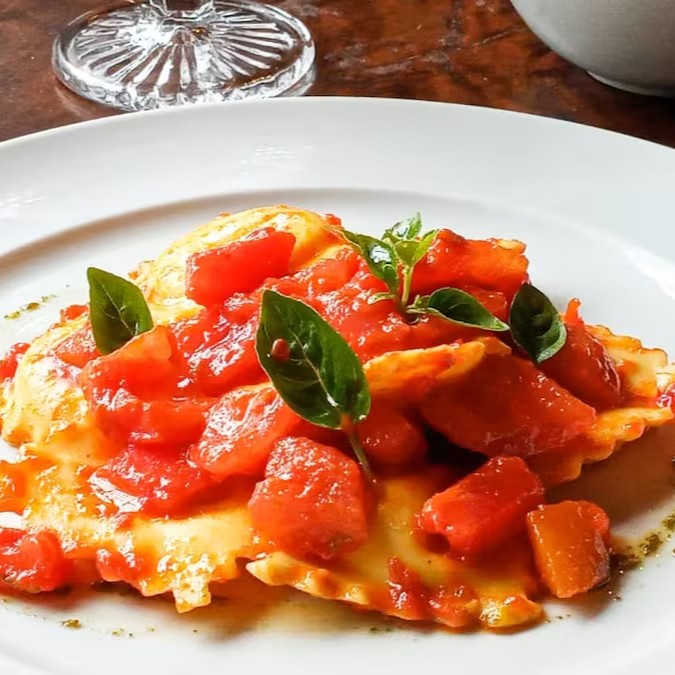 Ravióli de mozarela de búfala e parmesão com tomates frescos.