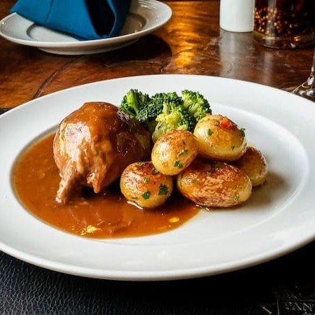 Pernil de cordeiro assado em molho de vinho e ervas servido com batatas rústicas com bacon e brócolis ou gnocchi salteado.