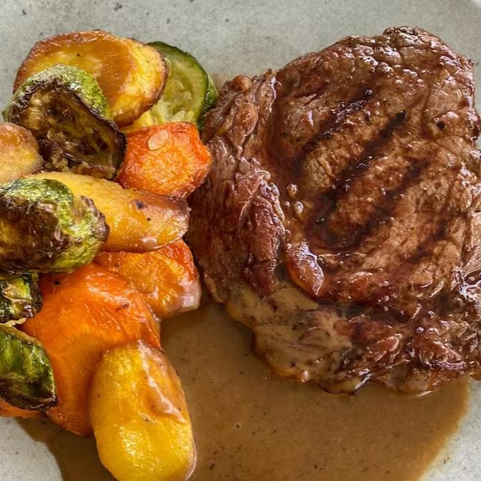Entrecot grelhado, servido com salada de folhas e legumes assados.