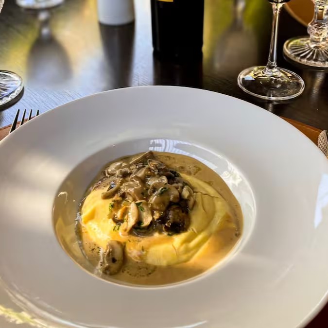 Polenta cremosa com molho funghi porcini e cogumelos frescos.