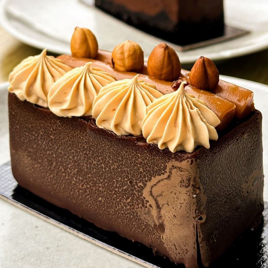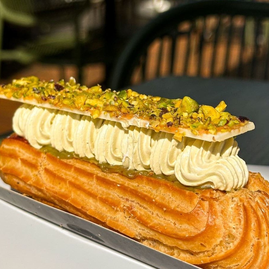Composta por: Massa choux, creme de pistache, compota de frutas vermelhas, morangos frescos, creme diplomata de pistache, placa de chocolate, caramelo e pistache moído.