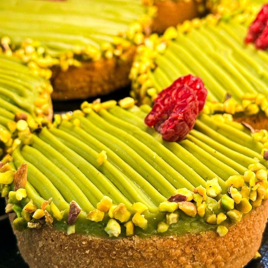 Pâte Sucrée, pão de ló branco, compota de morango e framboesas, crémeux de baunilha, crémeux de pistache, pistache picado, morango e framboesas frescos.