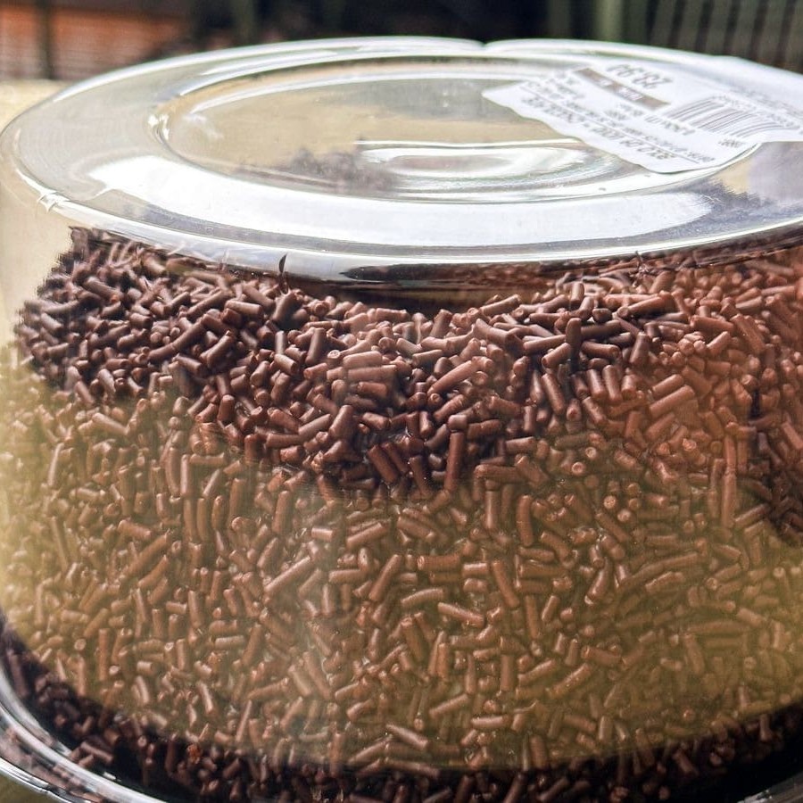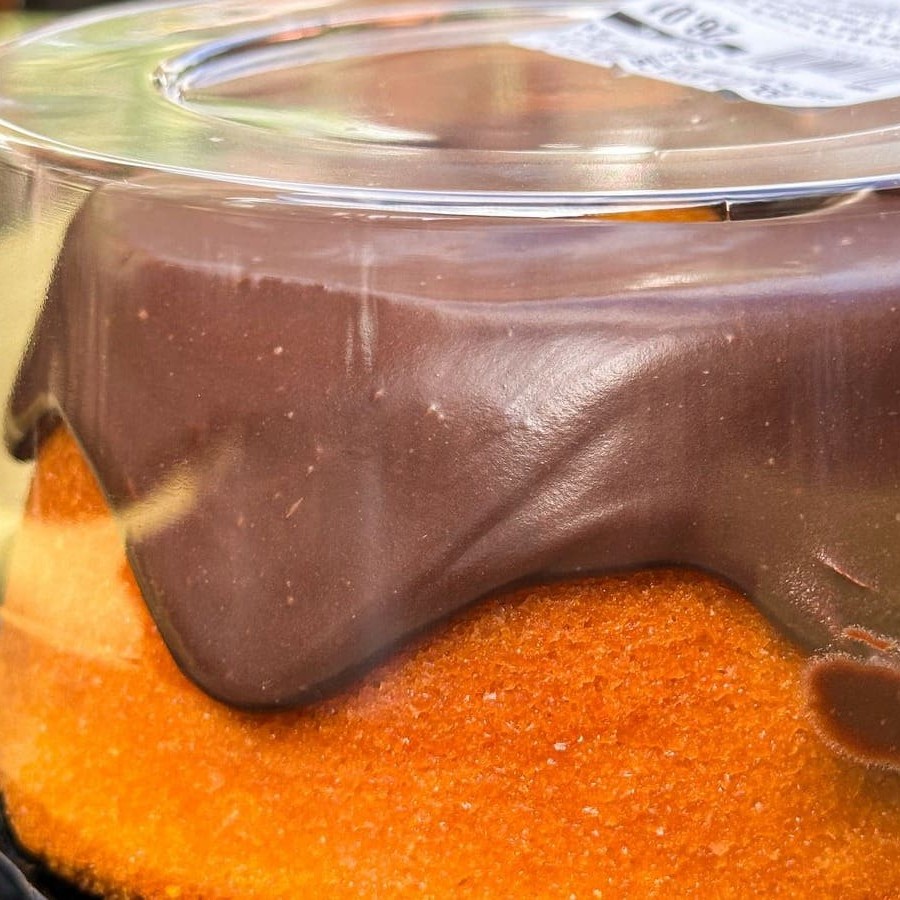 Bolo de chocolate, com cobertura de chocolate granulado. Contém Glúten. Contém Ovos. Pode conter derivados da soja, derivados do trigo, pode conter Leite. Aproximadamente 680g