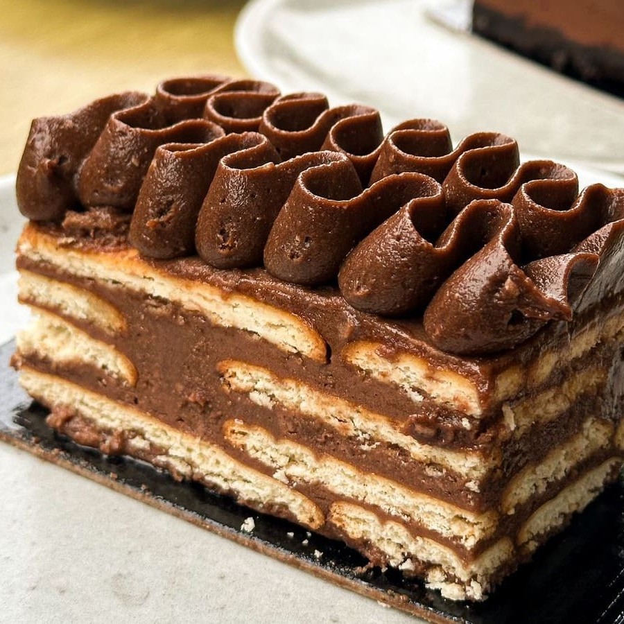 Camadas de bolacha recheadas com creme porto alegre. Um deleite irresistível. Este Pavê de Bolacha (fatia) é uma sintonia de sabores. Delicadas camadas de bolacha crocante são habilmente recheadas com nosso exuberante creme Porto Alegre, que se funde de maneira deliciosa, criando uma combinação de texturas e sabores incrivelmente harmoniosa, com doce na medida certa. Cada mordida é um convite para um momento de indulgência e prazer. Ahhhh esse creme Porto Alegre...