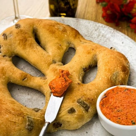 Pão em formato de folha com massa de fermentação natural, azeitonas e azeite de oliva. 'Fougasse', uma joia da categoria. Trata-se de um pão esplendidamente moldado em formato de folha, cuidadosamente preparado com uma massa de fermentação natural, que confere um sabor autêntico e uma textura inigualavelmente suave. Adicionados à massa, temos azeitonas cuidadosamente selecionadas, que proporcionam um toque de sabor mediterrâneo. Para finalizar, um generoso toque de azeite de oliva, que oferece um aroma sedutor e um toque final de requinte.