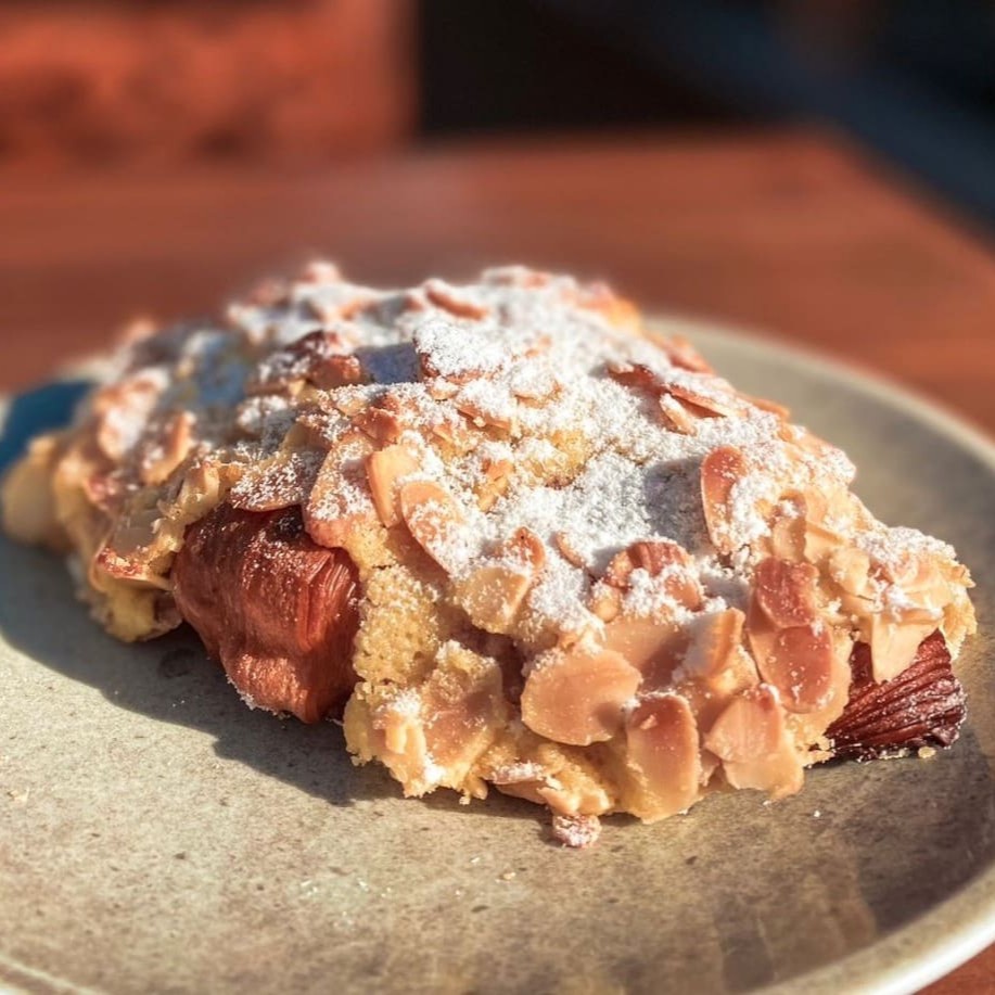 Croissant estilo francês recheado com creme de amêndoas e coberto com amêndoas laminadas torradas. Delicioso Croissant ao estilo Francês, meticulosamente recheado com um creme de amêndoas sedutoramente suave e luxuosamente rico. Este croissant é generosamente coberto com amêndoas laminadas, cuidadosamente selecionadas, que proporcionam um toque crocante irresistível. Uma viagem gastronômica a Paris a cada mordida. Perfeito para os amantes de amêndoas e da autêntica pastelaria francesa. Uma excelente escolha a qualquer hora do Dia com muita elegância.