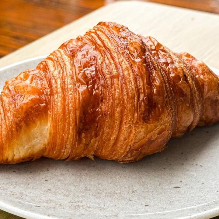 Croissant Grande de estilo francês e autêntico. Este primor culinário é uma delícia descomplicada, sem recheio para realçar o sabor irresistível da massa leve e aerada. Uma obra-prima da panificação, com uma crosta exterior crocante e uma interior macio e amanteigado. Perfeito para um café da manhã requintado ou um lanche da tarde sofisticado.