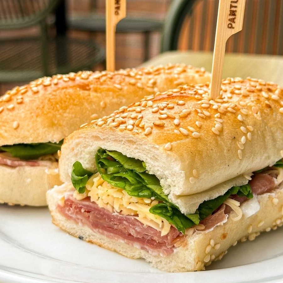 Salame, pasta de tomate seco, queijo prato, tomate fresco, alface americana. Descubra o ousado 'Salame Italiano',! Este suntuoso lanche apresenta generosas camadas de salame autêntico, enriquecido com uma vibrante pasta de tomate seco que agrega um sabor profundo e intenso. O queijo prato suave, adiciona uma cremosidade irresistível. Tudo isso é complementado por fatias de tomate fresco, trazendo um toque suculento, que unido à alface americana forma uma textura perfeita. Uma experiência culinária inesquecível em cada mordida!