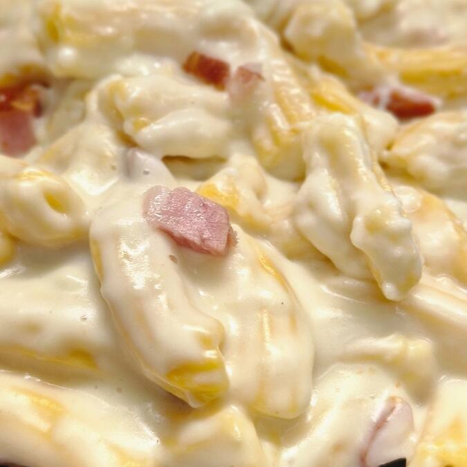 Macarrão cseiro com molho branco, bacon e muito queijo.