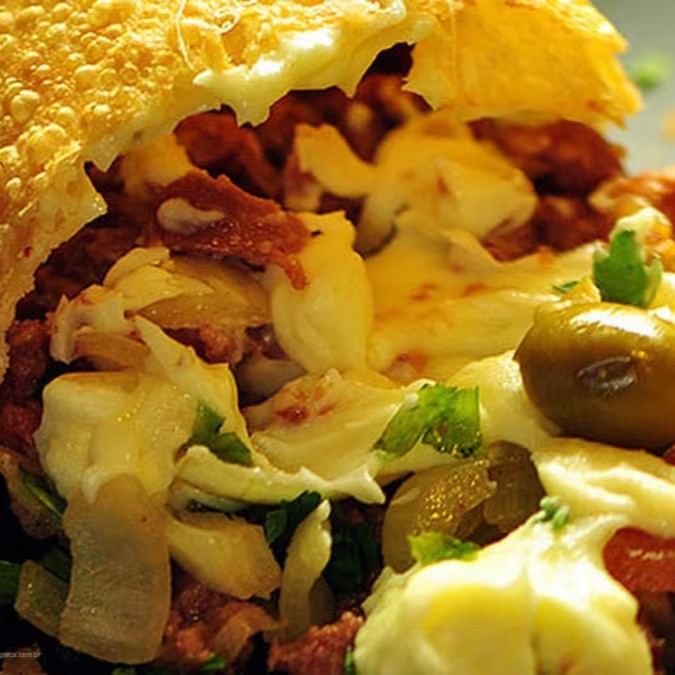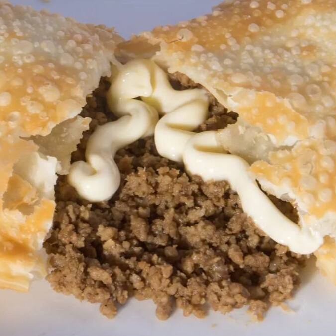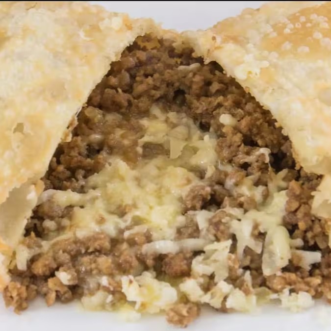Massa crocante recheada com carne bem temperada e requeijão cremoso, formando a combinação perfeita de sabor e textura em cada mordida.