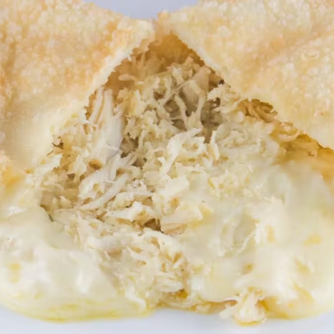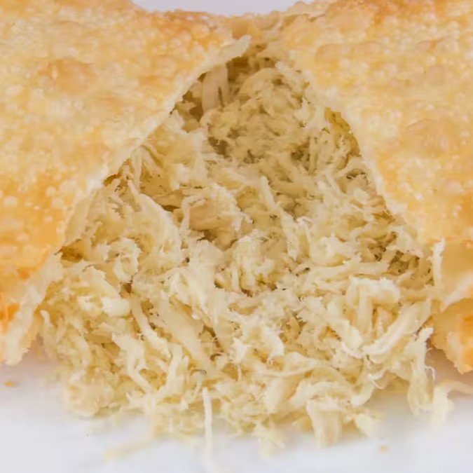 Massa crocante recheada com frango desfiado e requeijão cremoso, formando uma combinação irresistível de sabor e textura a cada mordida.