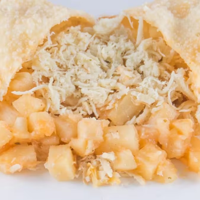 Crocante por fora e cremoso por dentro! Nosso pastel de frango com queijo é recheado com frango desfiado temperado e queijo derretido, formando a combinação perfeita de sabor e textura a cada mordida.