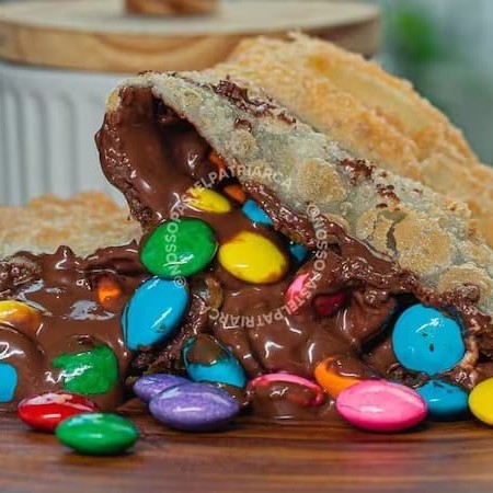 Desfrute de um saboroso pastel de Confete com chocolate ao leite, que oferece uma combinação alegre e cremosa, perfeita para saciar os desejos por doces com um toque de diversão.