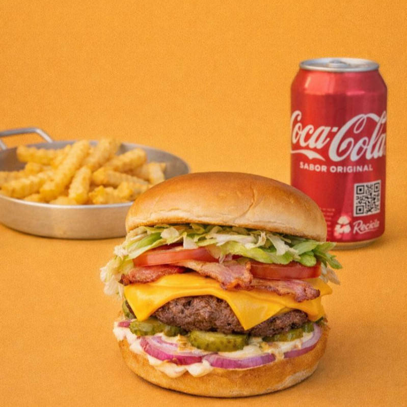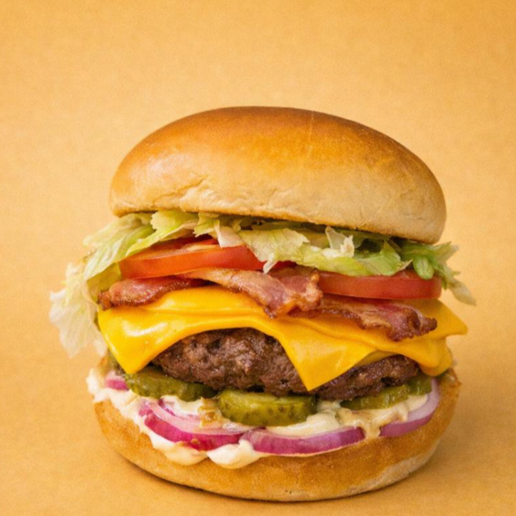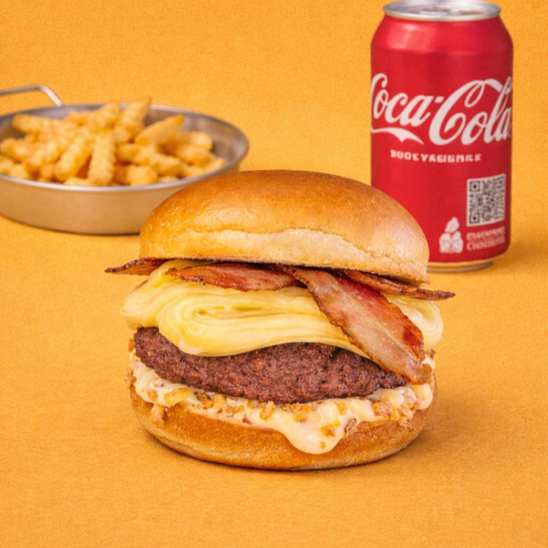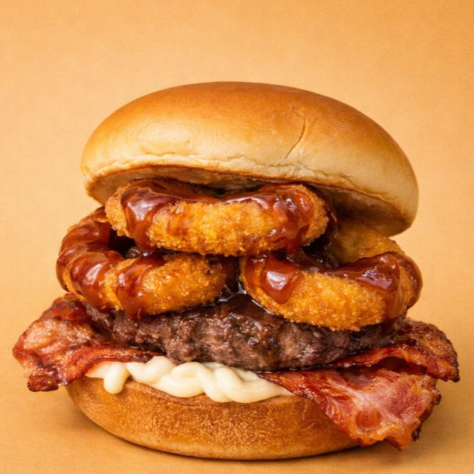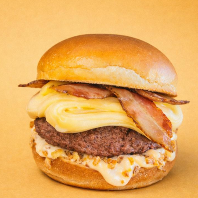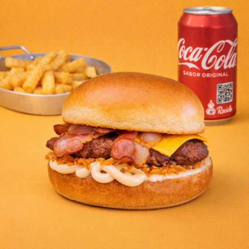 Smash Bacon: Um delicioso hambúrguer com pão, carne, queijo, maionese defumada, cebola crispy e um toque irresistível de bacon.