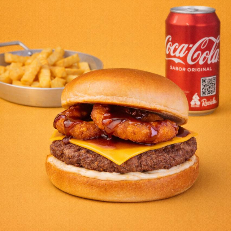 Smash Texas: Um hambúrguer irresistível com pão, carne, queijo, maionese defumada, anéis de cebola crocantes e molho barbecue, para uma explosão de sabores texanos